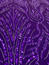 Sötétlila Couture csipke geometriai mintával, gyöngyökkel, gyöngyöcskékkel és flitterekkel