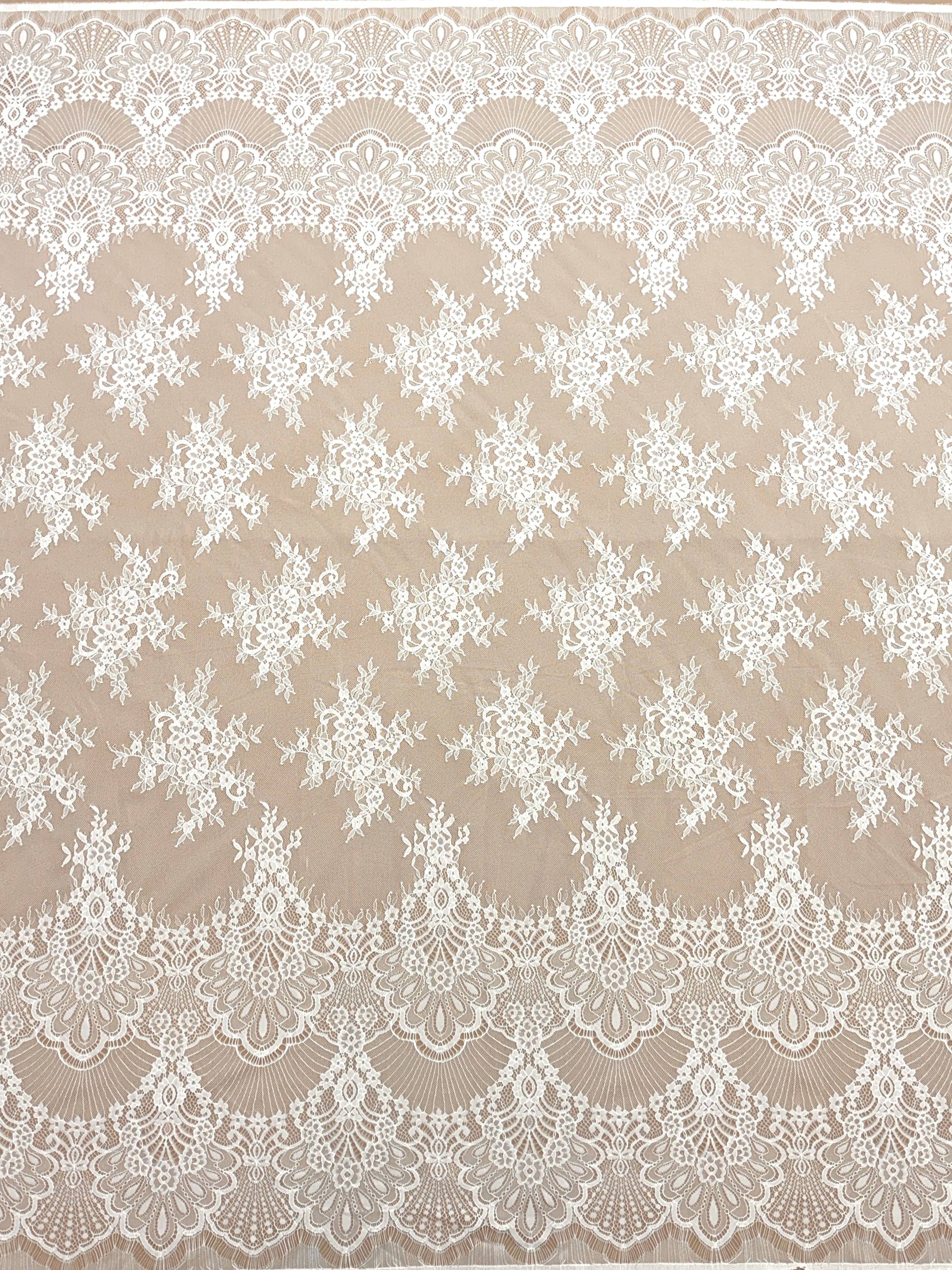 Kupon formájában szállítva ez a csipke Chantilly maximális rugalmasságot kínál hatásos ruhaalkotásokhoz, és a tervezők, műhelyek és couture dizájnerek körében népszerű választás.