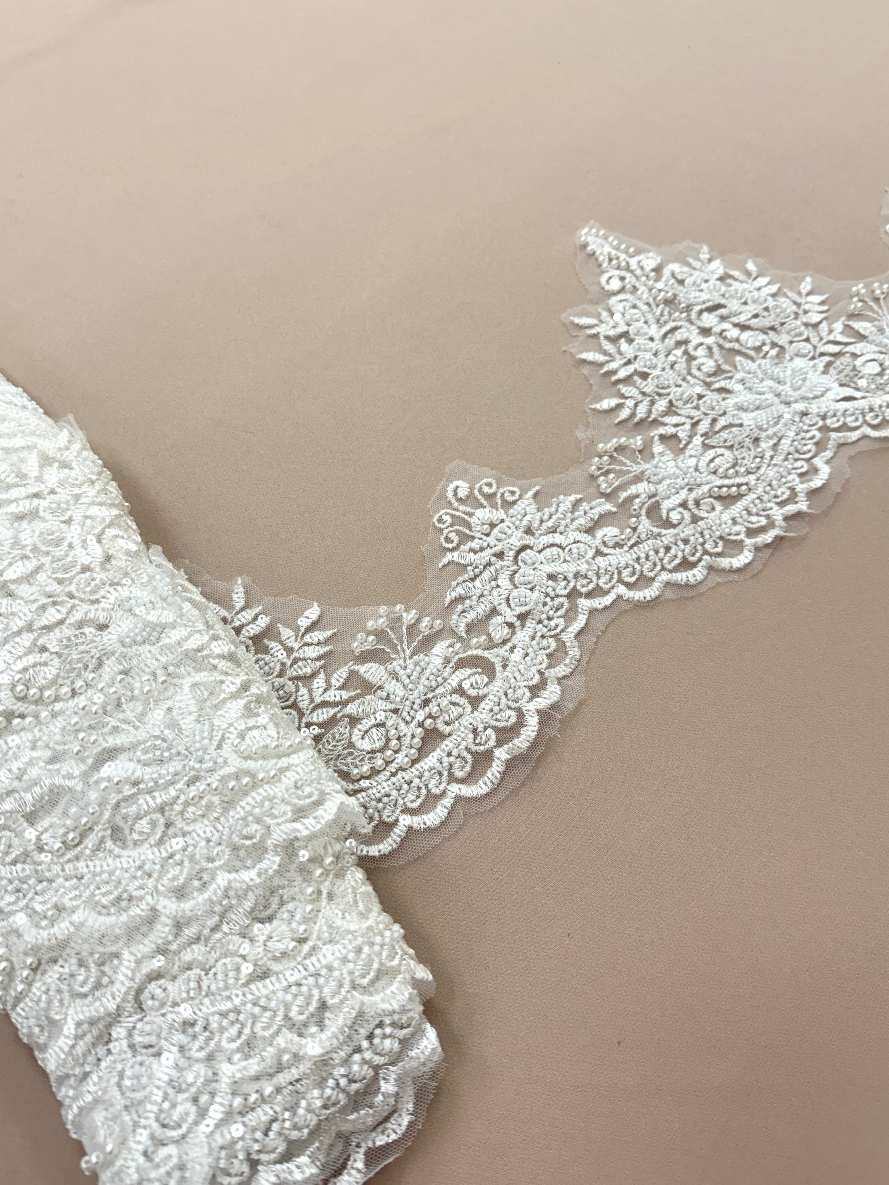 Aceasta dantela bordura decorativa, imbogatita cu perle, margele si paiete, este creata pentru acele proiecte in care detaliul face diferenta. Designul fin al dantelei este completat de elemente decorative aplicate cu grija, rezultand un echilibru armonios intre delicatete si stralucire discreta.