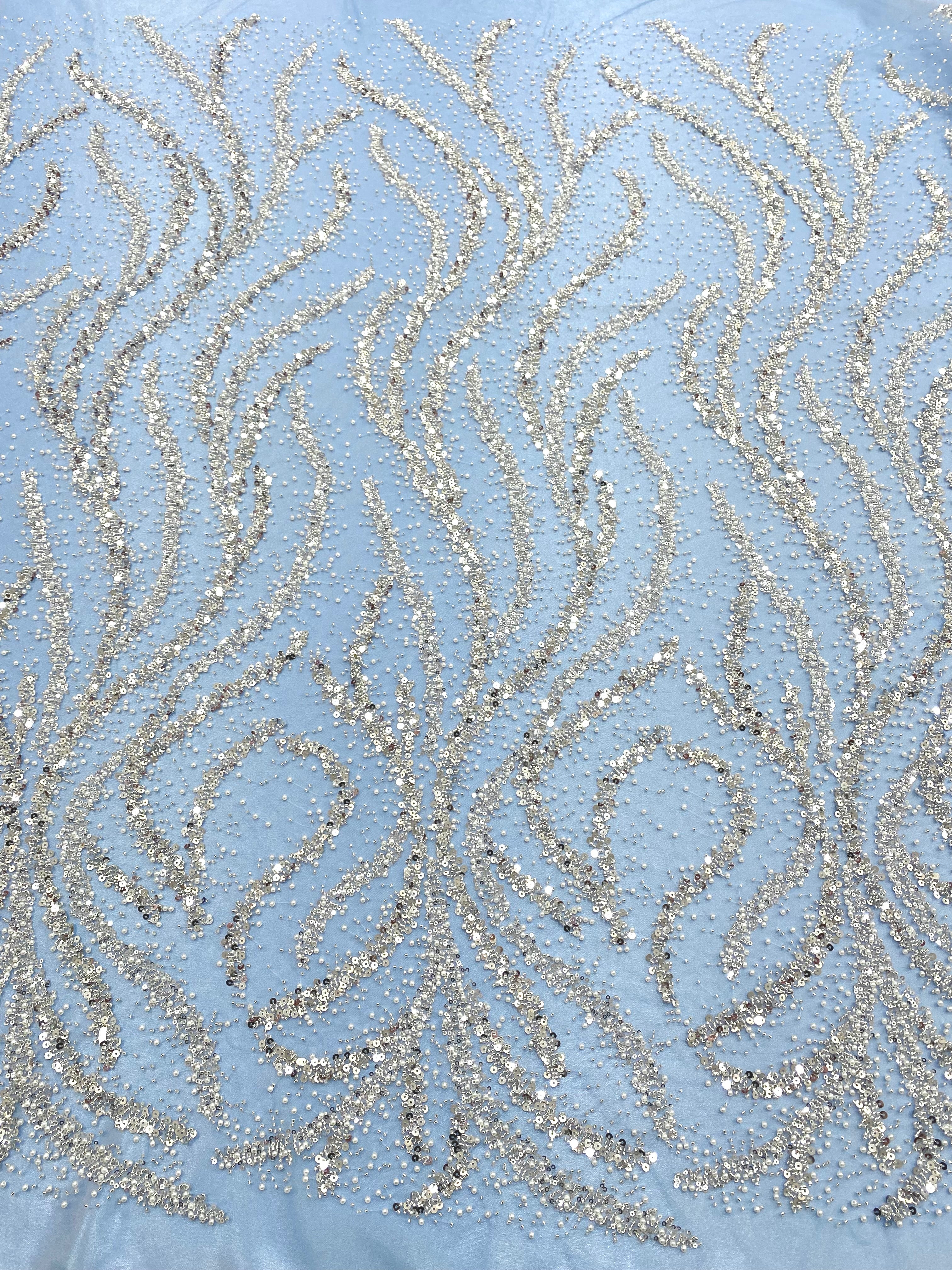 Dantela Couture Argintie pe Tulle Bleu cu Perle, Margele si Paiete