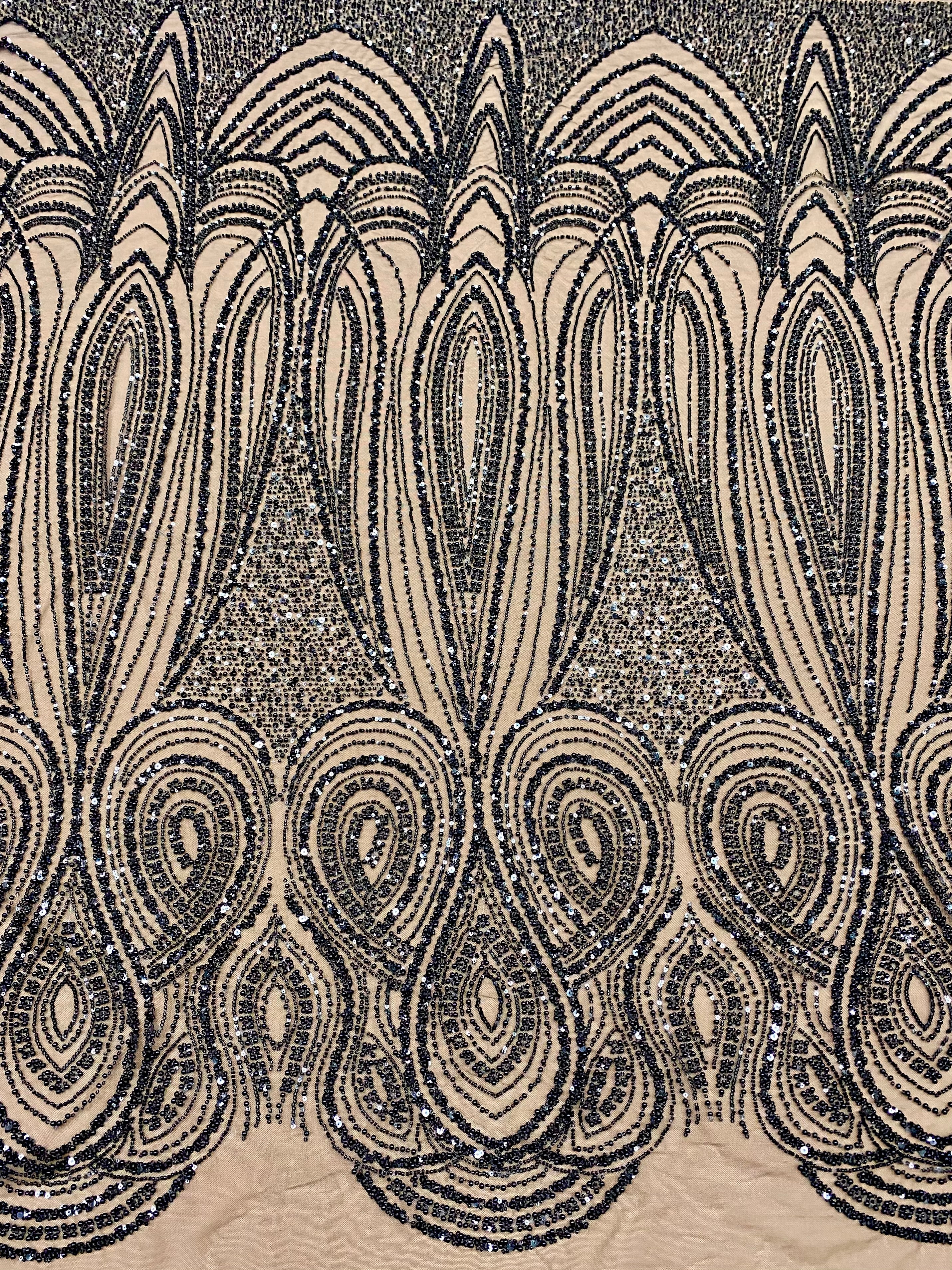 Dantela Couture Neagra cu Model Geometric, cu Perle, Margele si Paiete