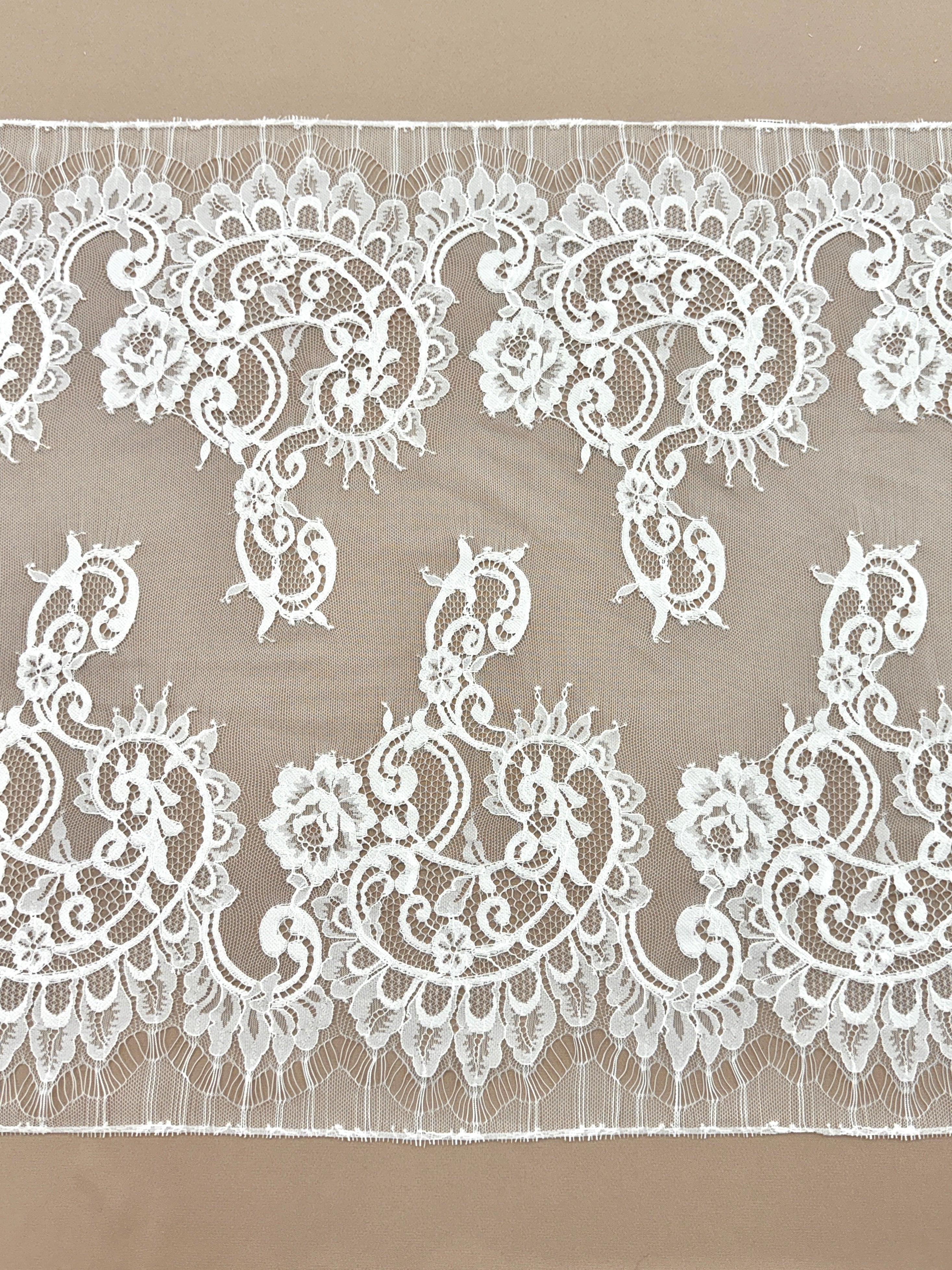 Dantela bordura dubla Chantilly ivory este un material delicat, caracterizat prin doua randuri de borduri decorative identice si un design floral fin, perfect pentru o tinuta bridal. Structura sa echilibrata si repetitia eleganta a motivului fac aceasta dantela ideala pentru aplicatii vizibile si detalii couture.
