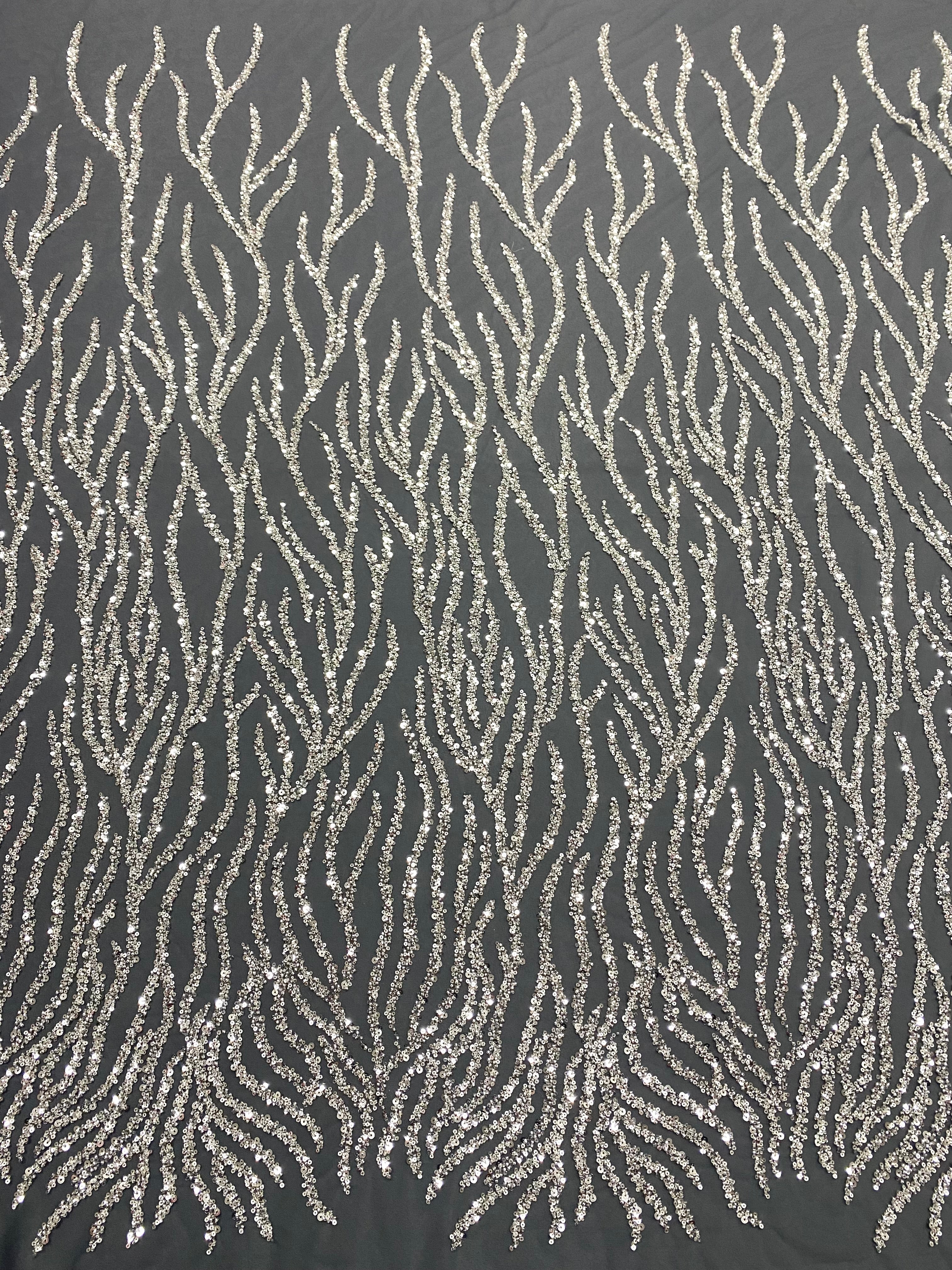 Dantela Couture Argintie pe Tulle Antracit cu Siraguri, cu Margele si Paiete