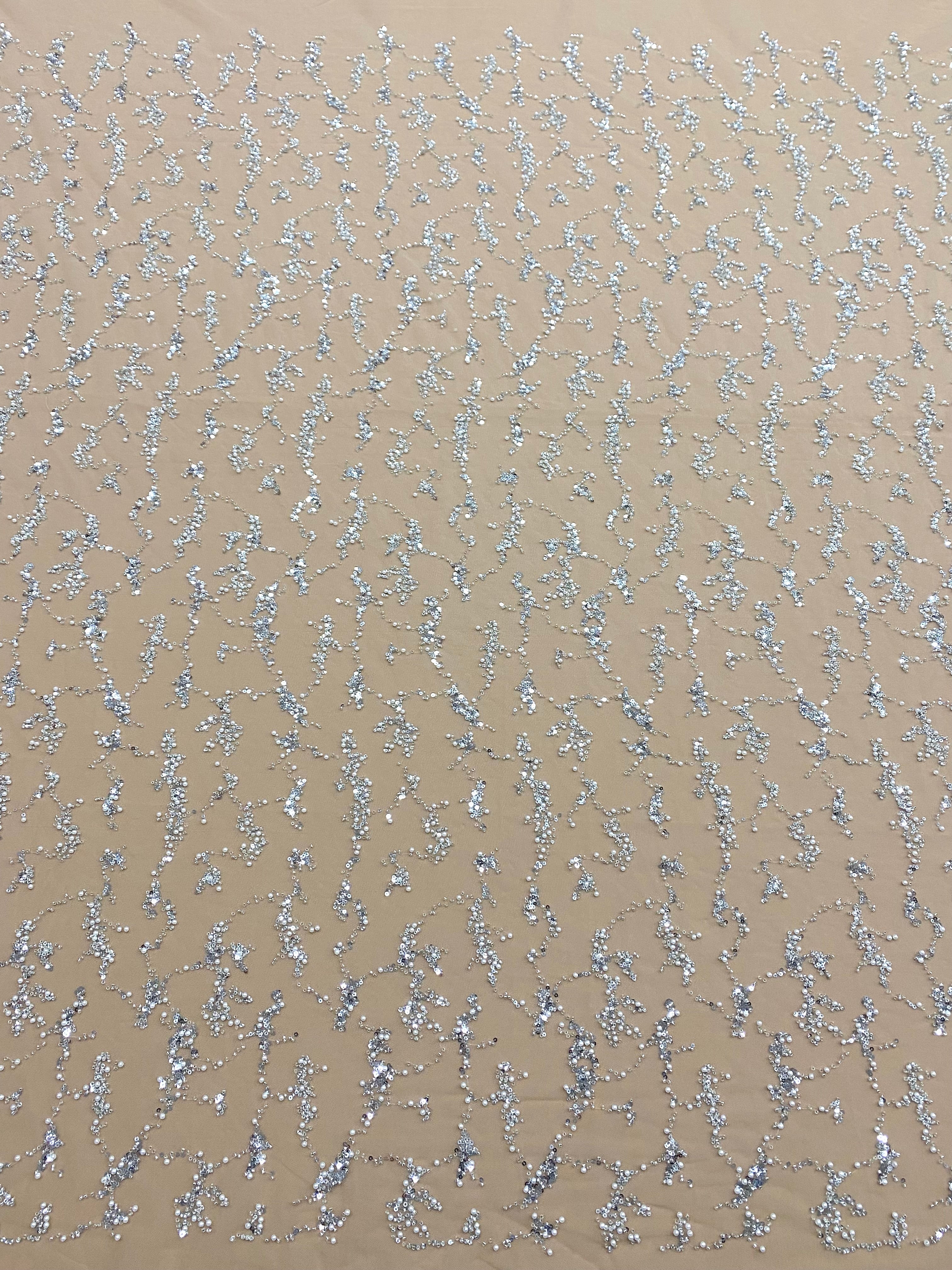 Dantela Couture Argintie pe Tulle Nude, cu Perle, Margele si Paiete