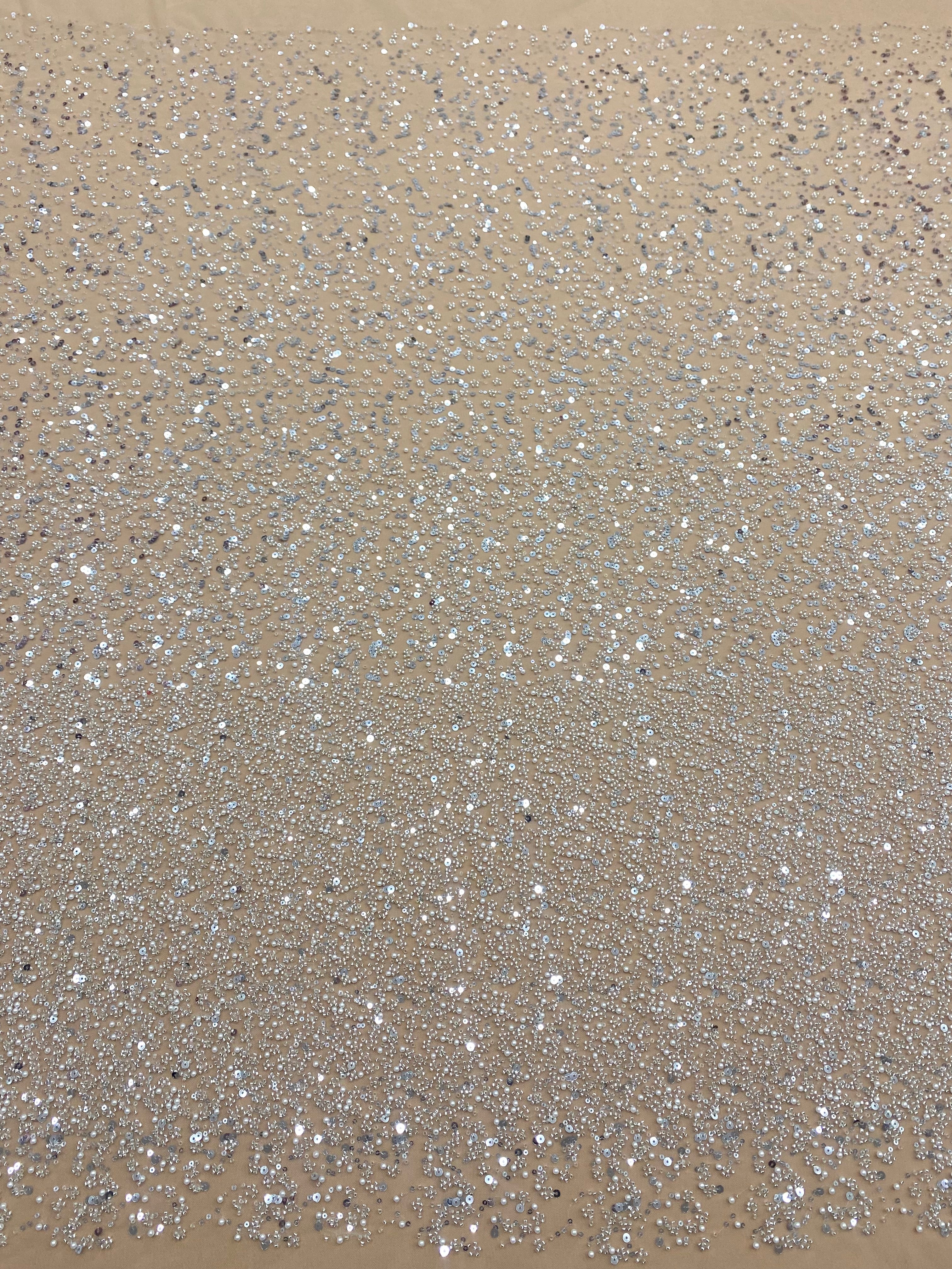 Dantela Couture Argintie pe Tulle Nude in Degrade, cu Perle, Margele si Paiete