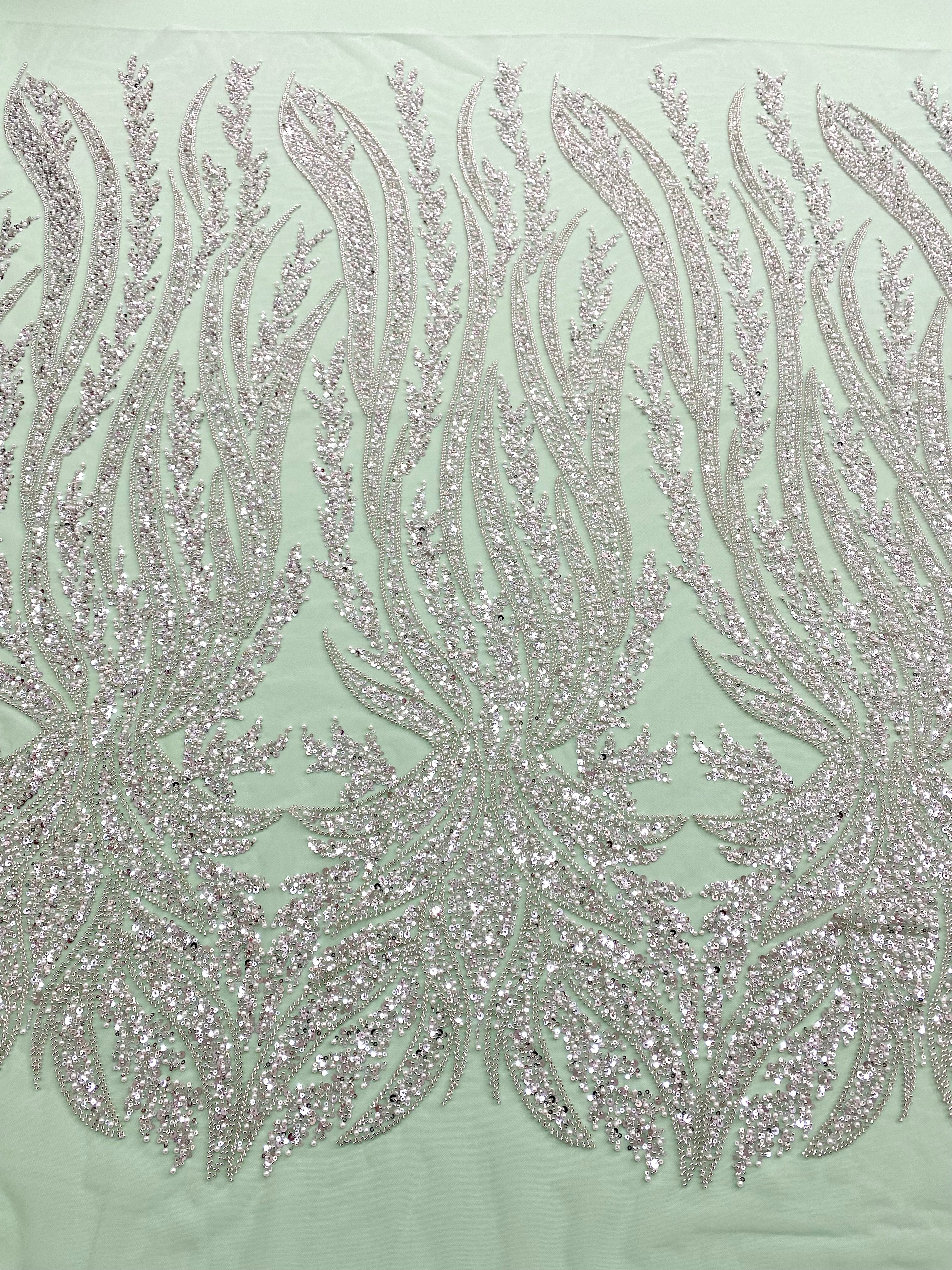Dantela Couture Argintie pe Tulle Verde Menta cu Panou, cu Perle, Margele si Paiete