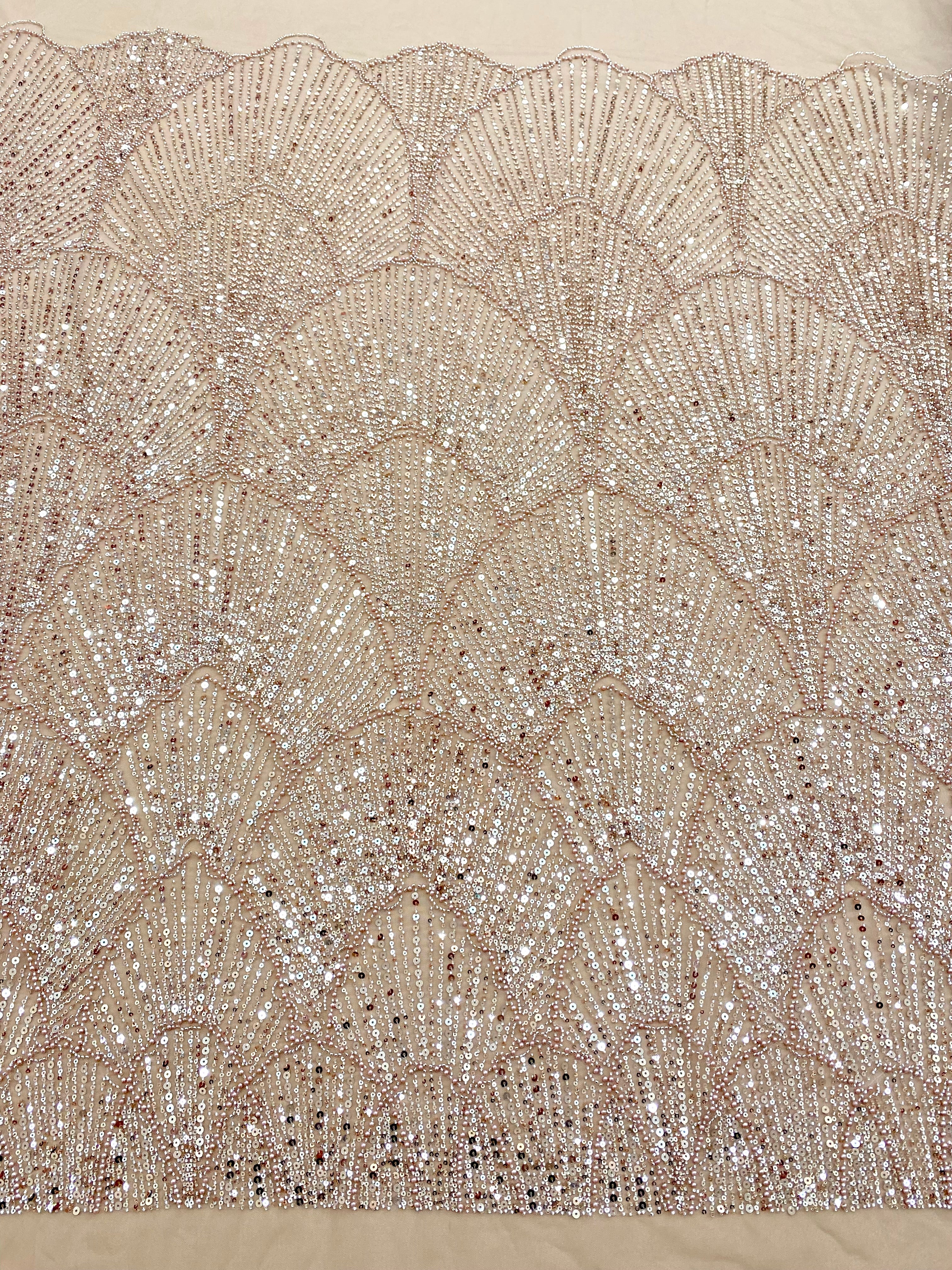 Dantela Couture Auriu Rose cu Model Geometric, cu Perle, Margele si Paiete