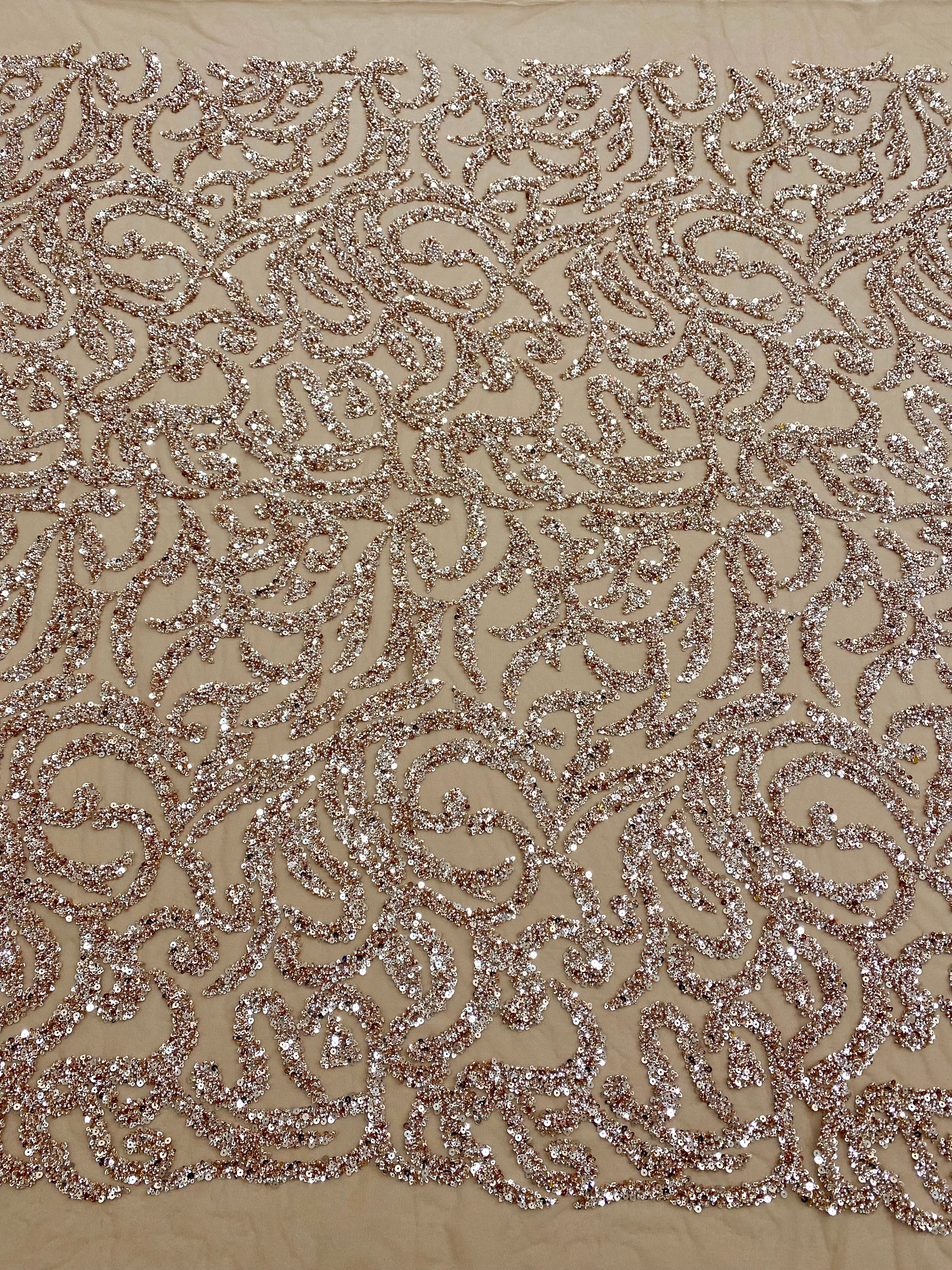 Dantela Couture Auriu Rose cu Model Geometric, cu Margele si Paiete