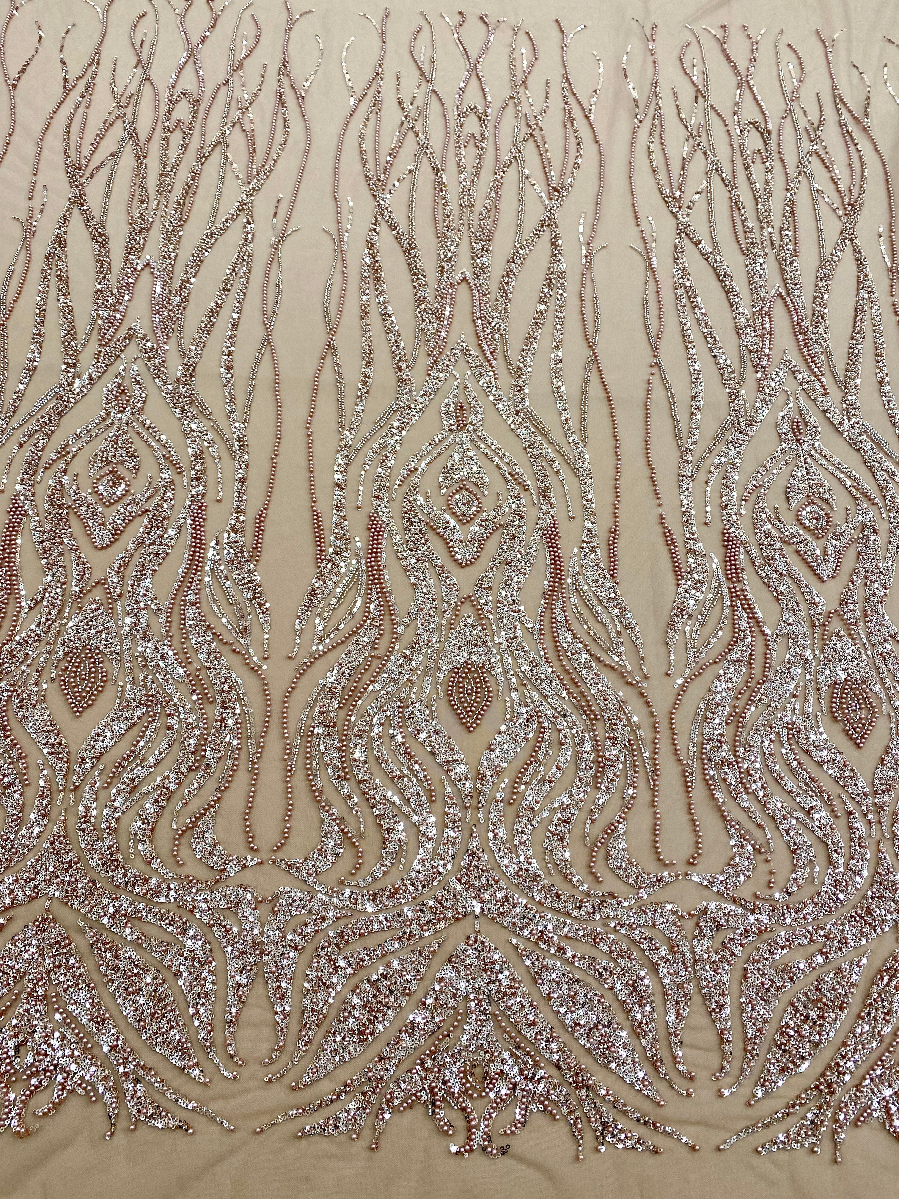 Dantela Couture Auriu Rose cu Model Geometric, cu Perle, Margele si Paiete