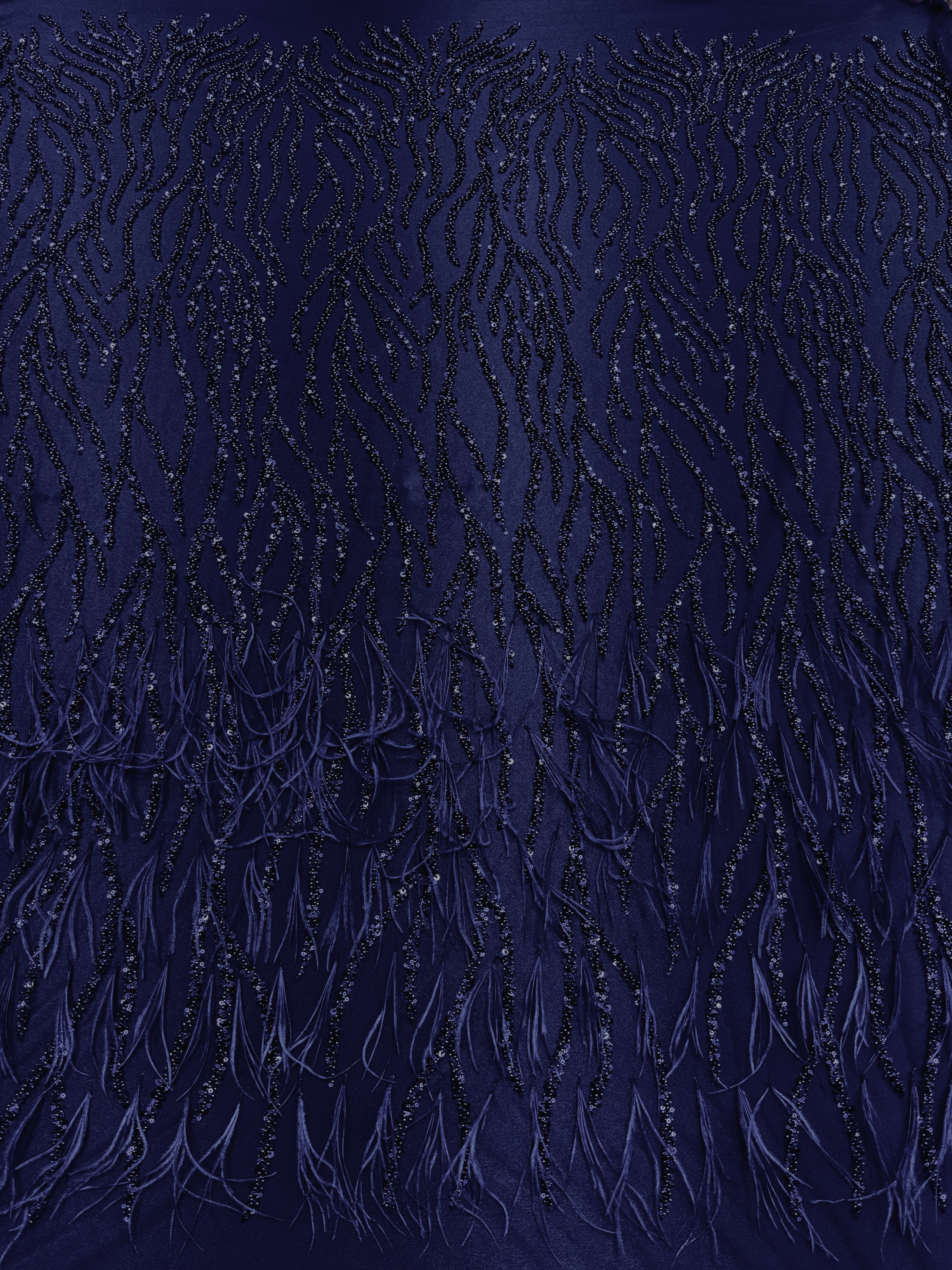 Dantela Couture Bleumarin cu Pene de Strut, cu Siraguri, cu Margele si Paiete