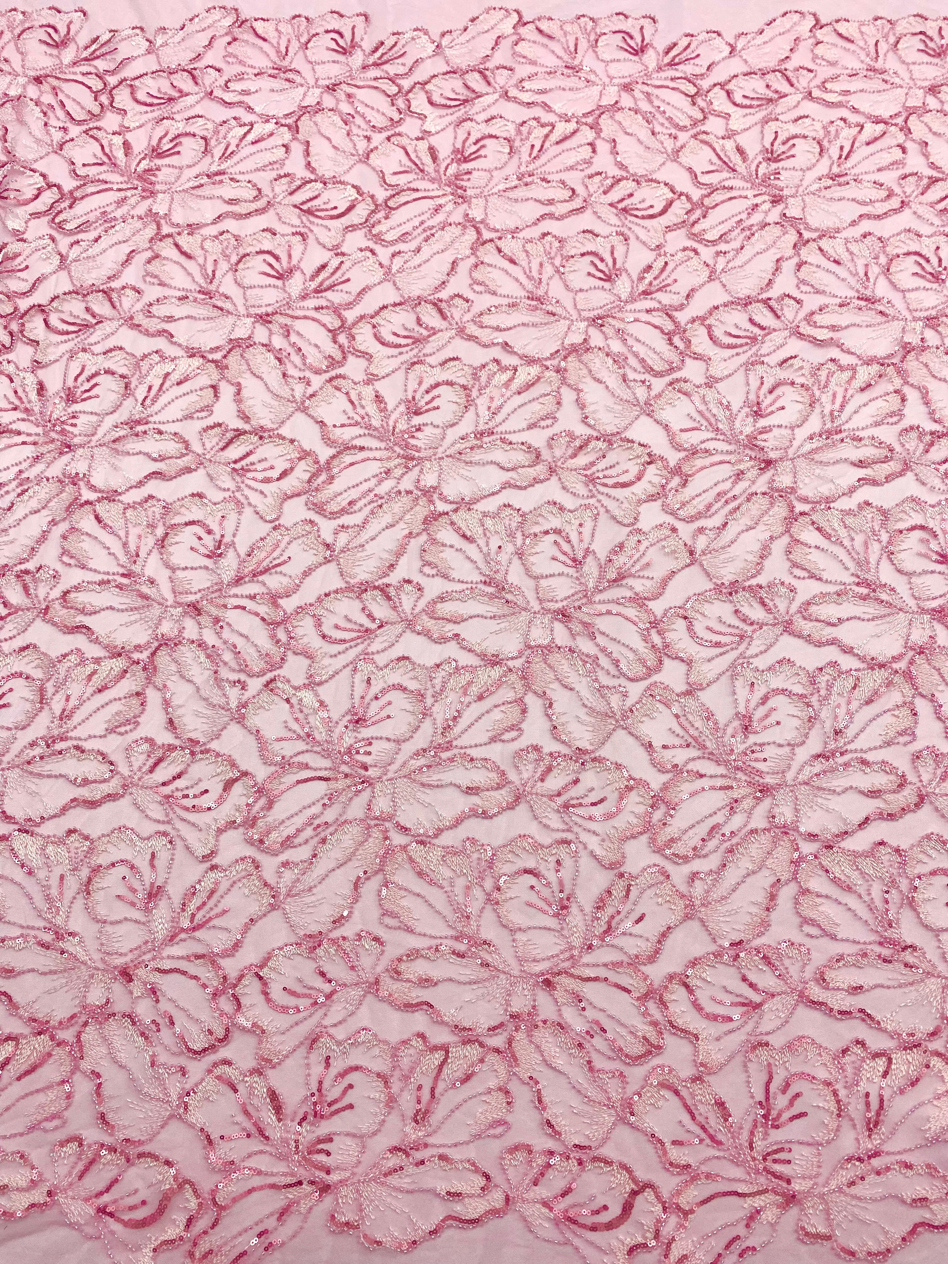 Dantela Couture Roz cu Model Floral, cu Margele si Paiete