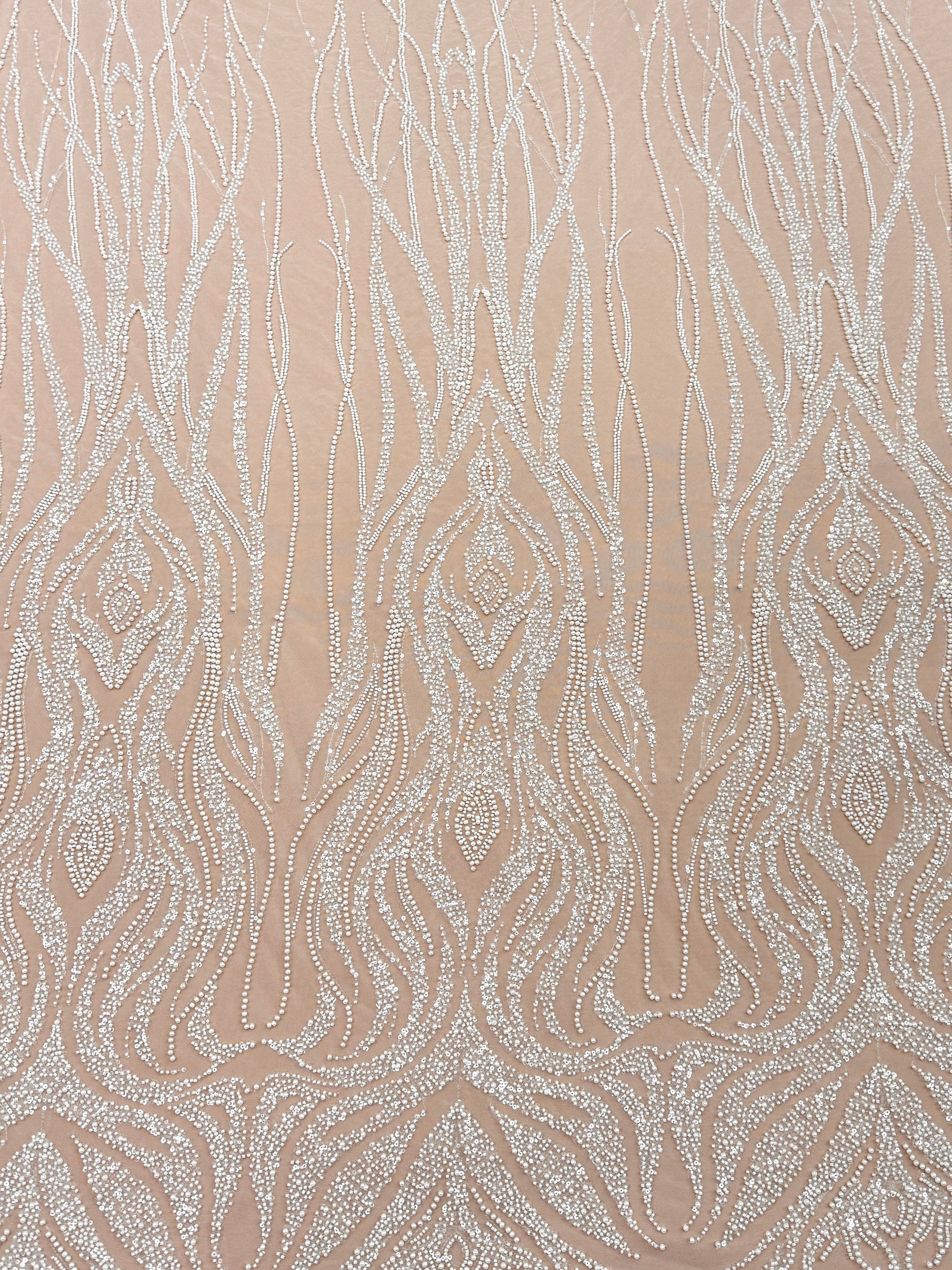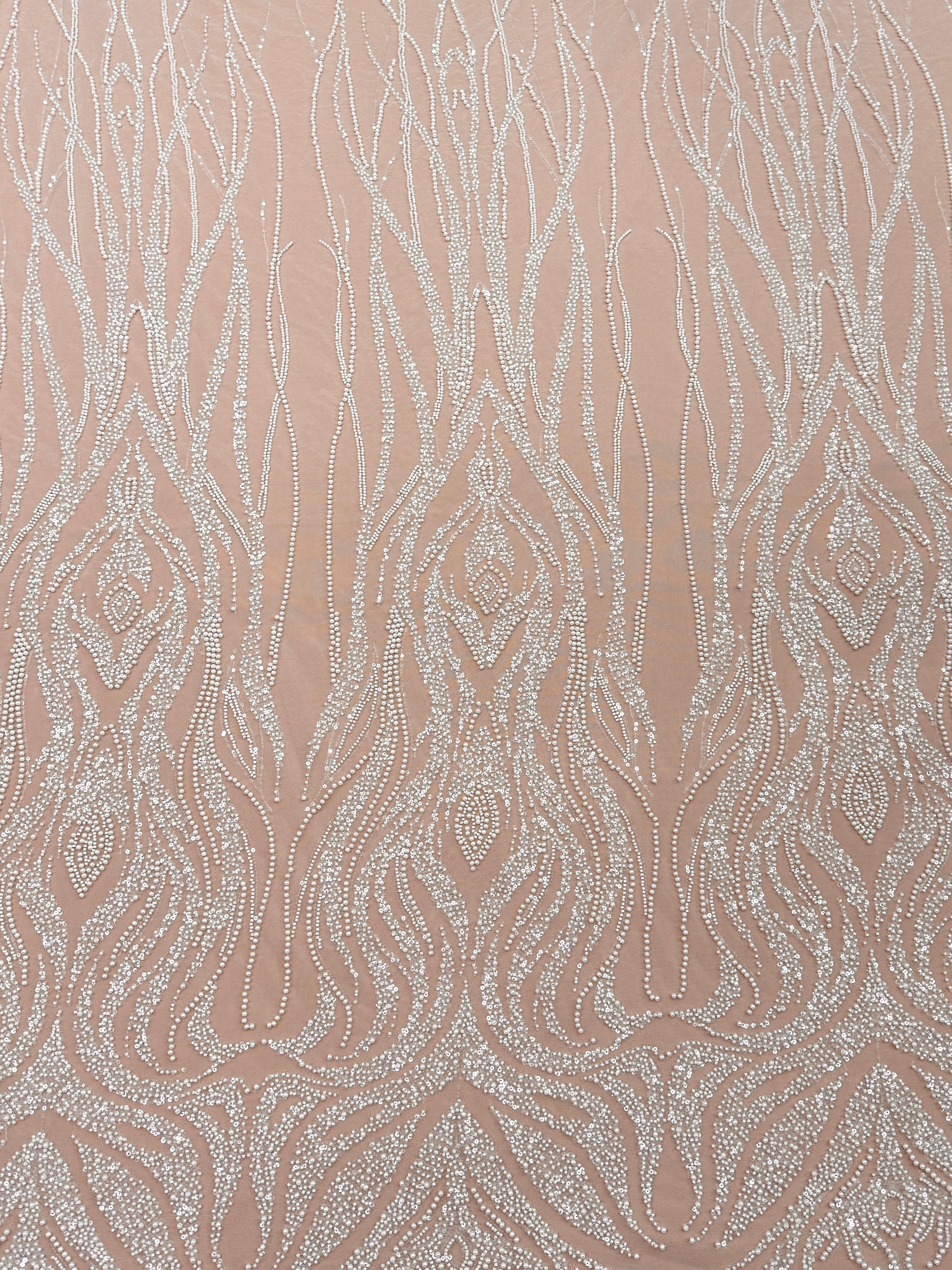 Dantela Ivory cu Model Geometric, cu Perle, Margele si Paiete