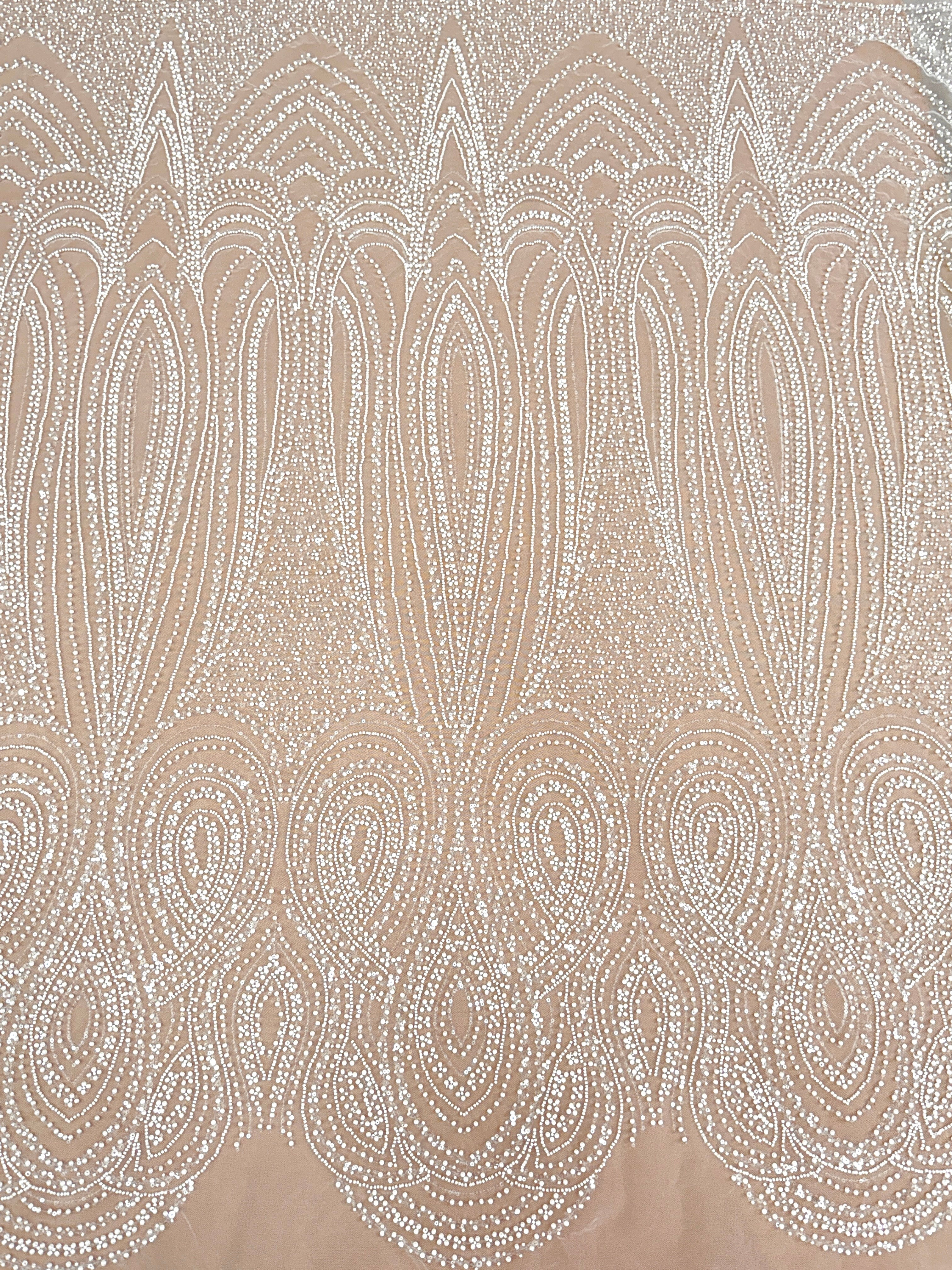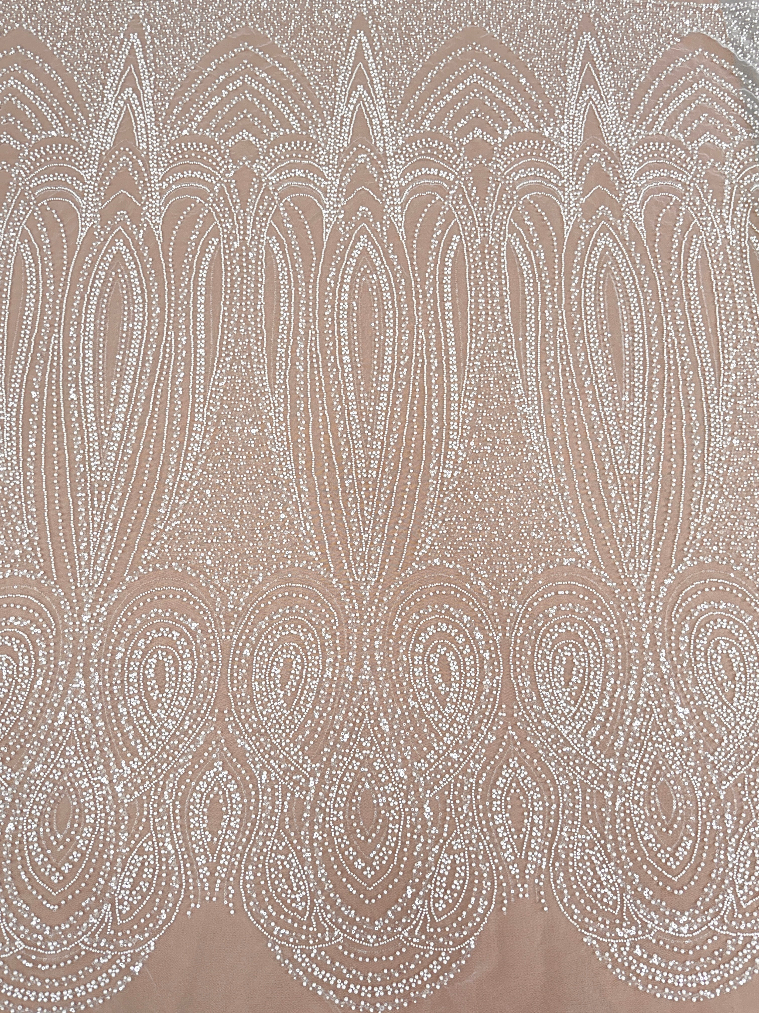 Dantela Ivory cu Model Geometric, cu Perle, Margele si Paiete
